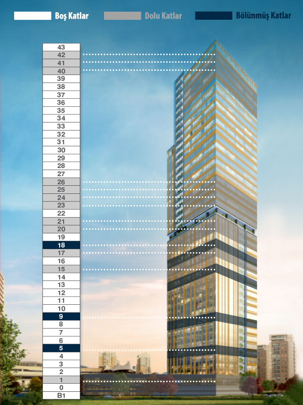 TEMMUZ 2014 EKİM 2014 100.000 m² 55.000 m² 43 OFİS KATI 930 - 1096 m² 631 - 800 m² 3,90 m 4 BORULU FCU 8 YOLCU + 1 YÜK + 3 OTOPARK 1012 15 -18 GOLD LEED SERTİFİKASI |